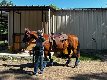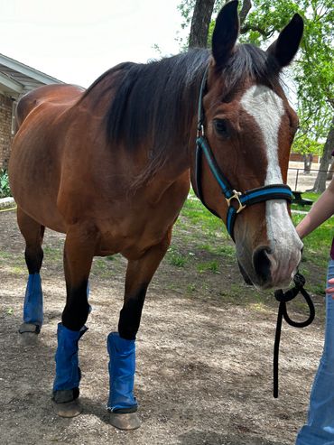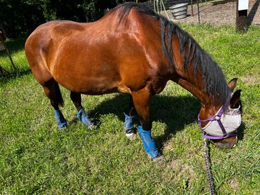 She can be tender-footed on one front hoof, so she has boots she wears occasionally. Roux likes going for walks with green grass best of all!